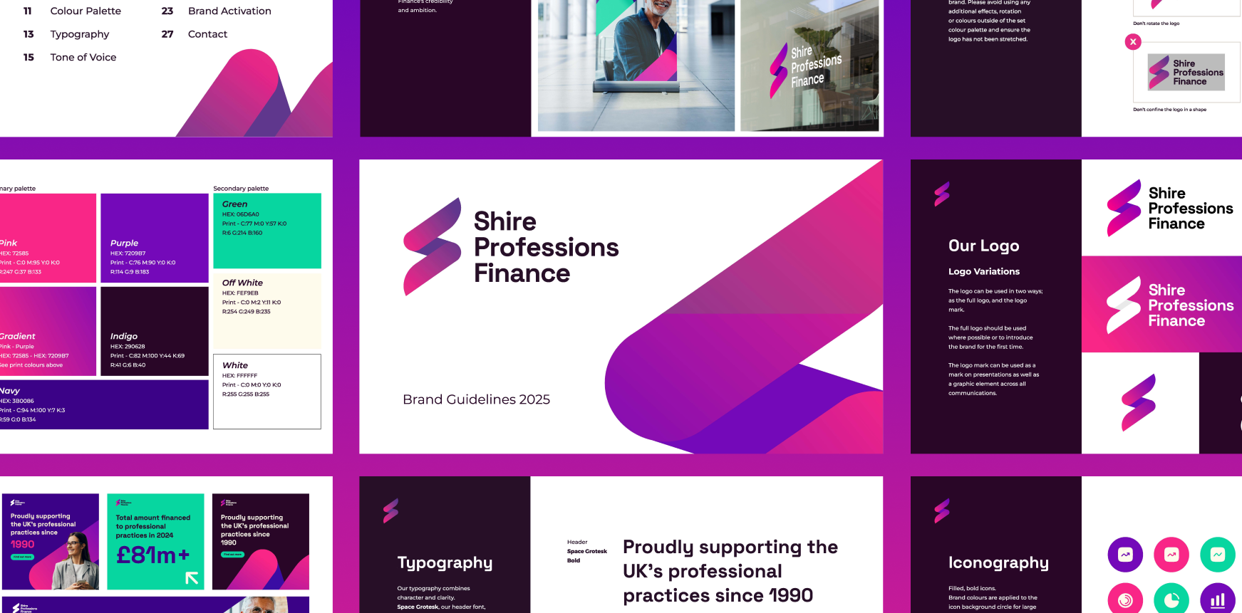 Shire Professions Finance required a fresh brand strategy and visual identity, moving away from their previous association with Shire Leasing PLC and towards a new look and feel that was more consistent and in line with their offering.