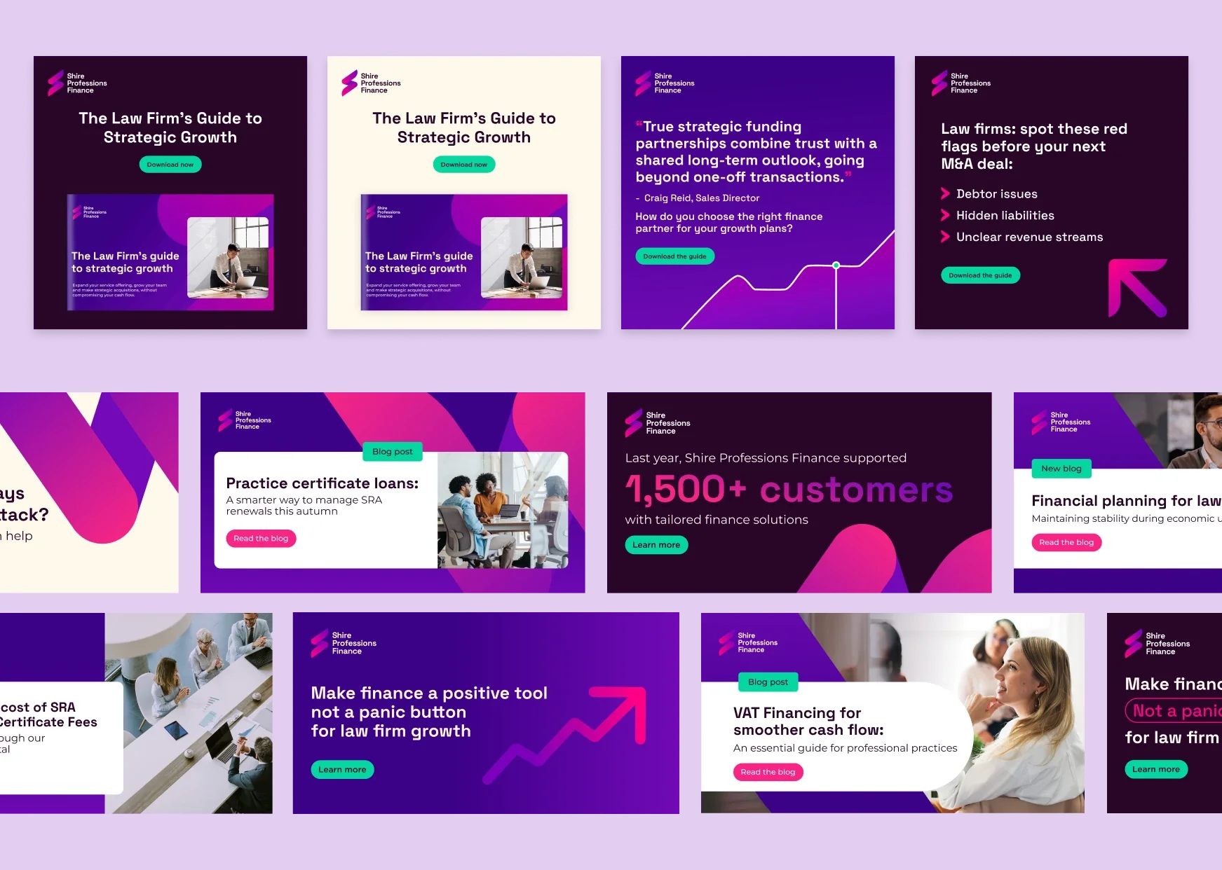 Since their launch, we have supported Shire Professions Finance with ongoing marketing, from launching high-value thought leadership guides, to delivering regular email cadence, engaging organic social posts, and LinkedIn ads that have translated their new branding across all marketing channels.
